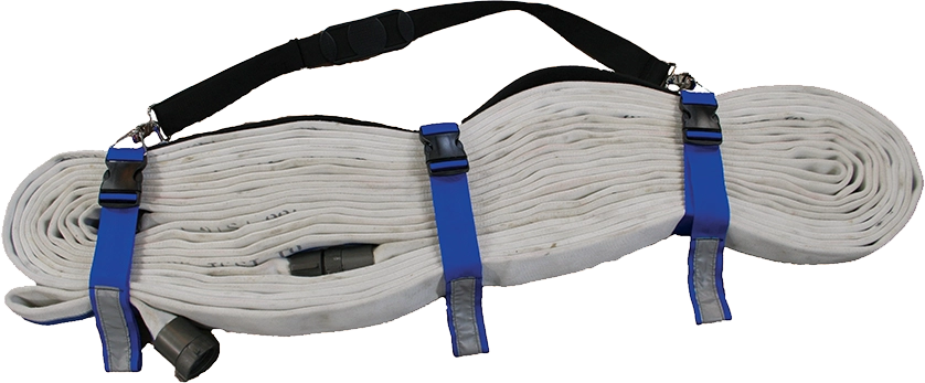 THE CLEVELAND LOAD. Cleveland hose lay is designed to be connected to and laid on top of a 100’ length of pre-attached hose in your cross lay or hose bed. When making up the Cleveland lay for a cross lay or hose bed, it should be the length of your pre-connect. Pull the hose bundle out and place over your shoulder, and as you walk, you will pull the remainder of the 100’ of hose from the hose bed until it is fully deployed. THE CLEVELAND STRAPS #M/S-CHLS. This is a set of 3 straps to be used for a 100’ hose. The 3 straps are made with 2” Delrin® side release buckles that are easily released with your gloves on. There is a looped end for cinching. This set up allows one person to easily deploy up to 150’ of hose. The straps are available in royal blue and weigh 16 oz.